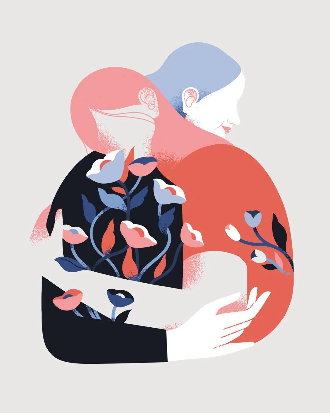 Illustrations for the article "Generations Connected," which discusses how different generations connect and the ways older generations enrich the lives of younger ones. Women share their knowledge about life, home, faith, and children with one another, fostering flourishing through connection.
